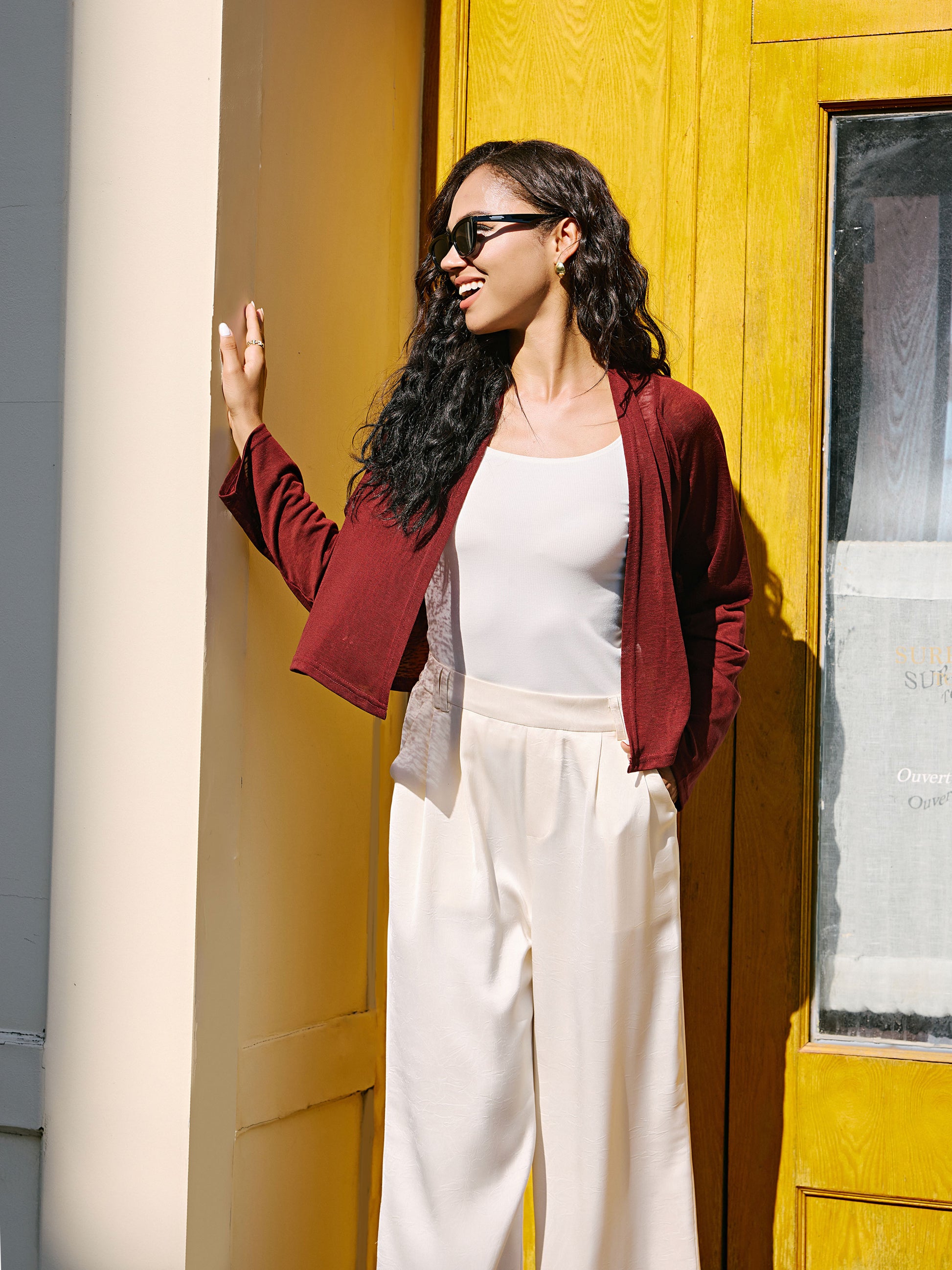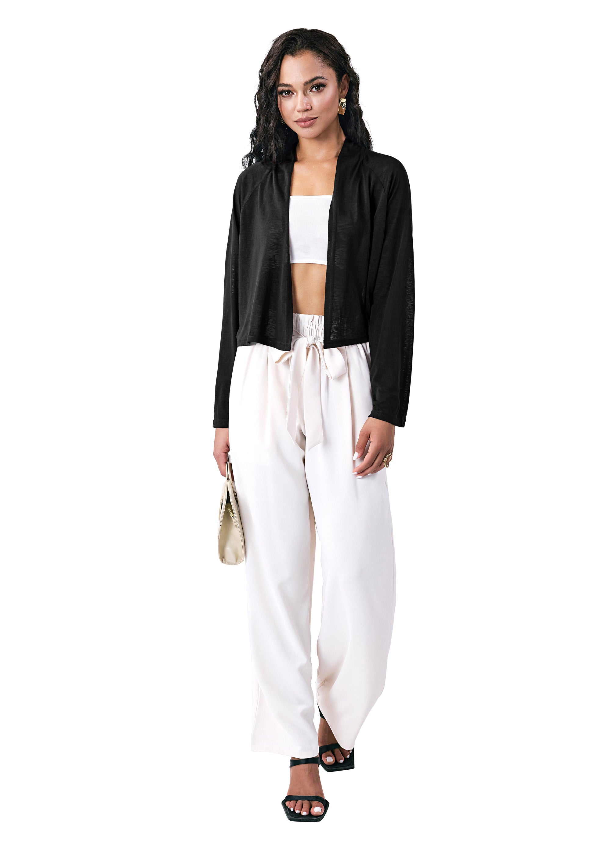 This open-front shrug features a relaxed fit with drop shoulder sleeves, making it perfect for pairing with dresses. The cropped length highlights your waistline without overwhelming your figure, offering comfort and style for both casual and office wear.